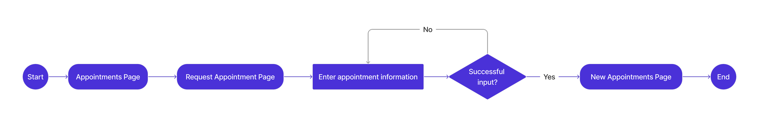 After prioritizing features informed by my user research, I created a site map. This site map gave me the opportunity to assess the ways in which pet owner’s will interact with the features. I organized the main features in a way that corresponded with the past, present, and future of a pet’s health. The past is represented by medical history, the present by home, and the future by appointments.