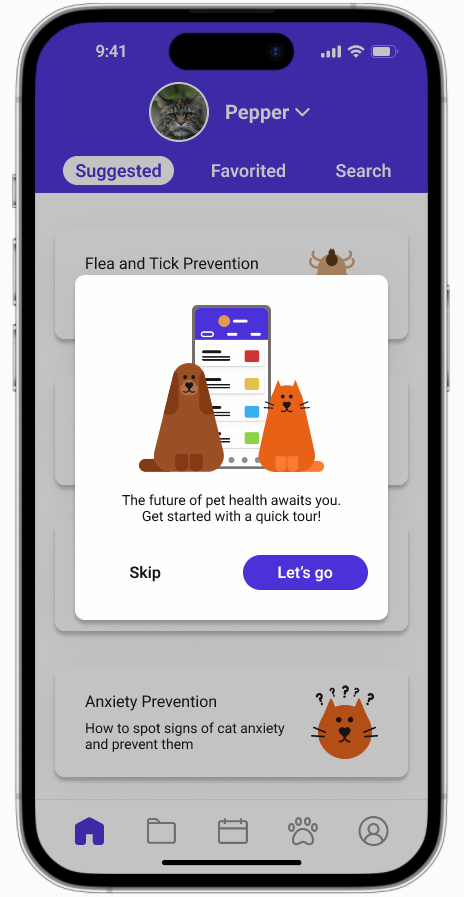 I took the designs from my mid-fidelity wireframing and elevated them by combining them with UI components that evoked the Petter brand. After I created my first high-fidelity prototype, I conducted usability testing. Although all of the users successfully completed the tasks, there were some hangups when it came to adding an additional pet and switching from one pet to another. Some users were not sure about the navigation steps necessary to complete these tasks. These users clicked other navigation icons out of habit or, in the case of switching pets, questioned where the navigation was. A short optional tutorial was created to instruct first time users of the app’s navigation.