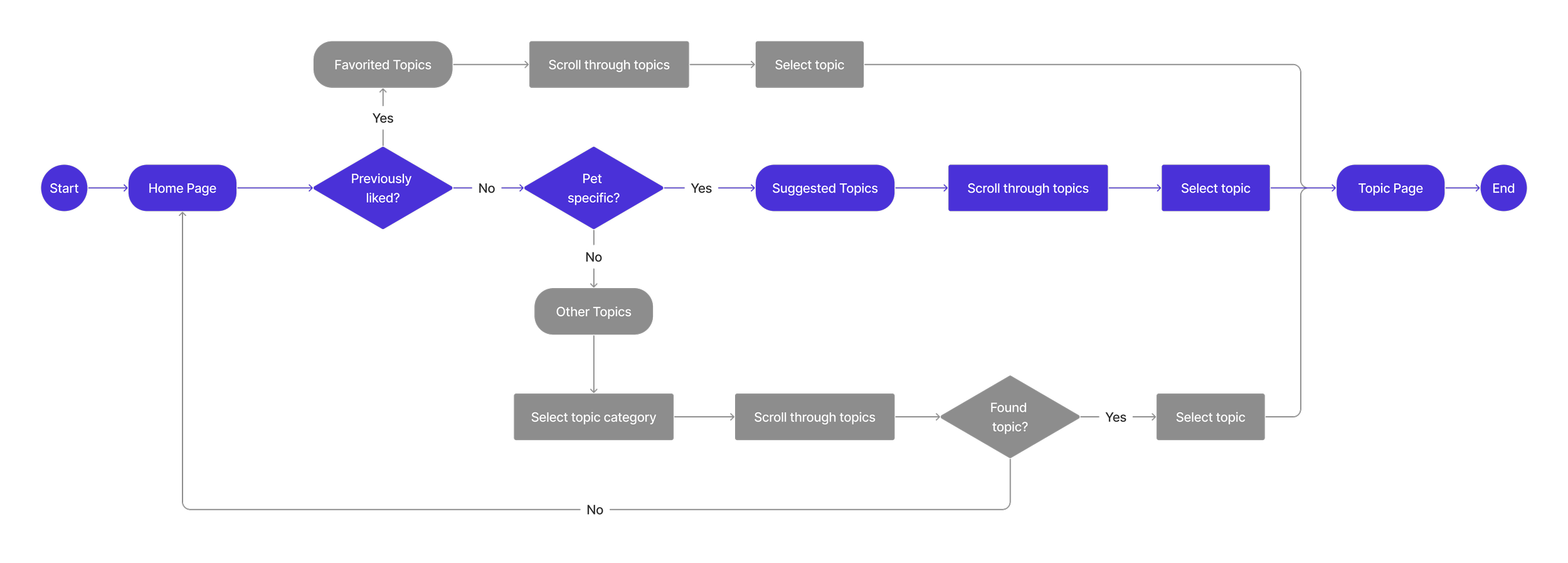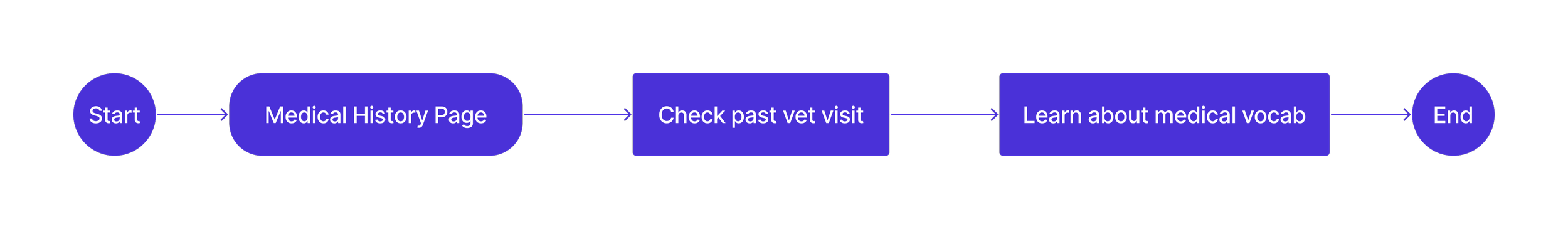 User flows were created to flesh out the feature interaction design. They allowed me to view interacting with the app through the linear lens that a user would. I was able to use the flows to determine the most efficient route for delivering pet health information to the user.