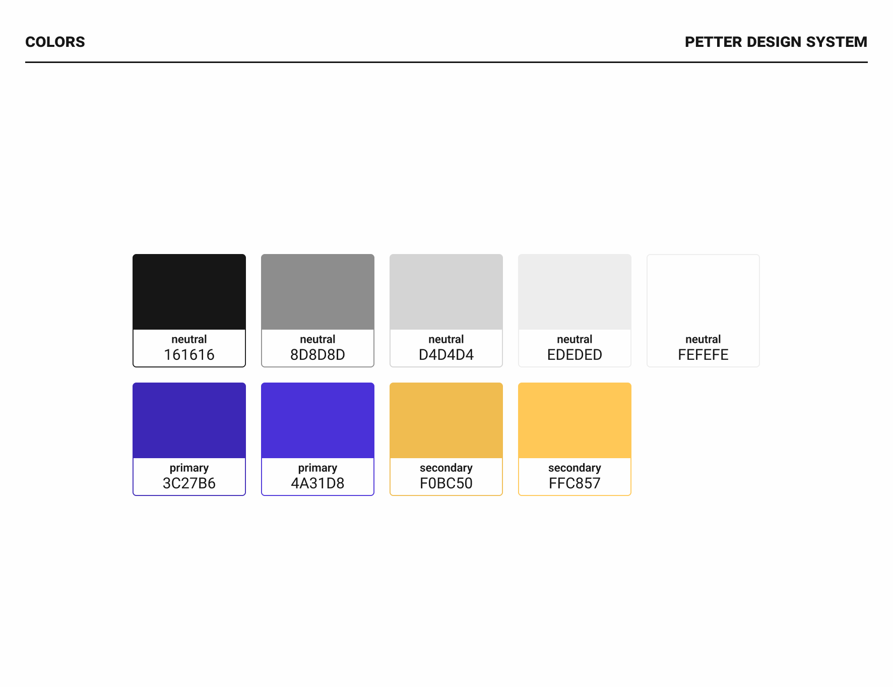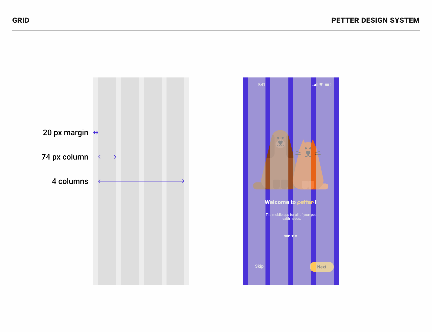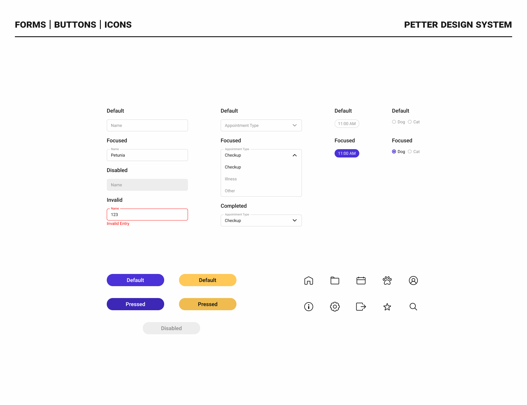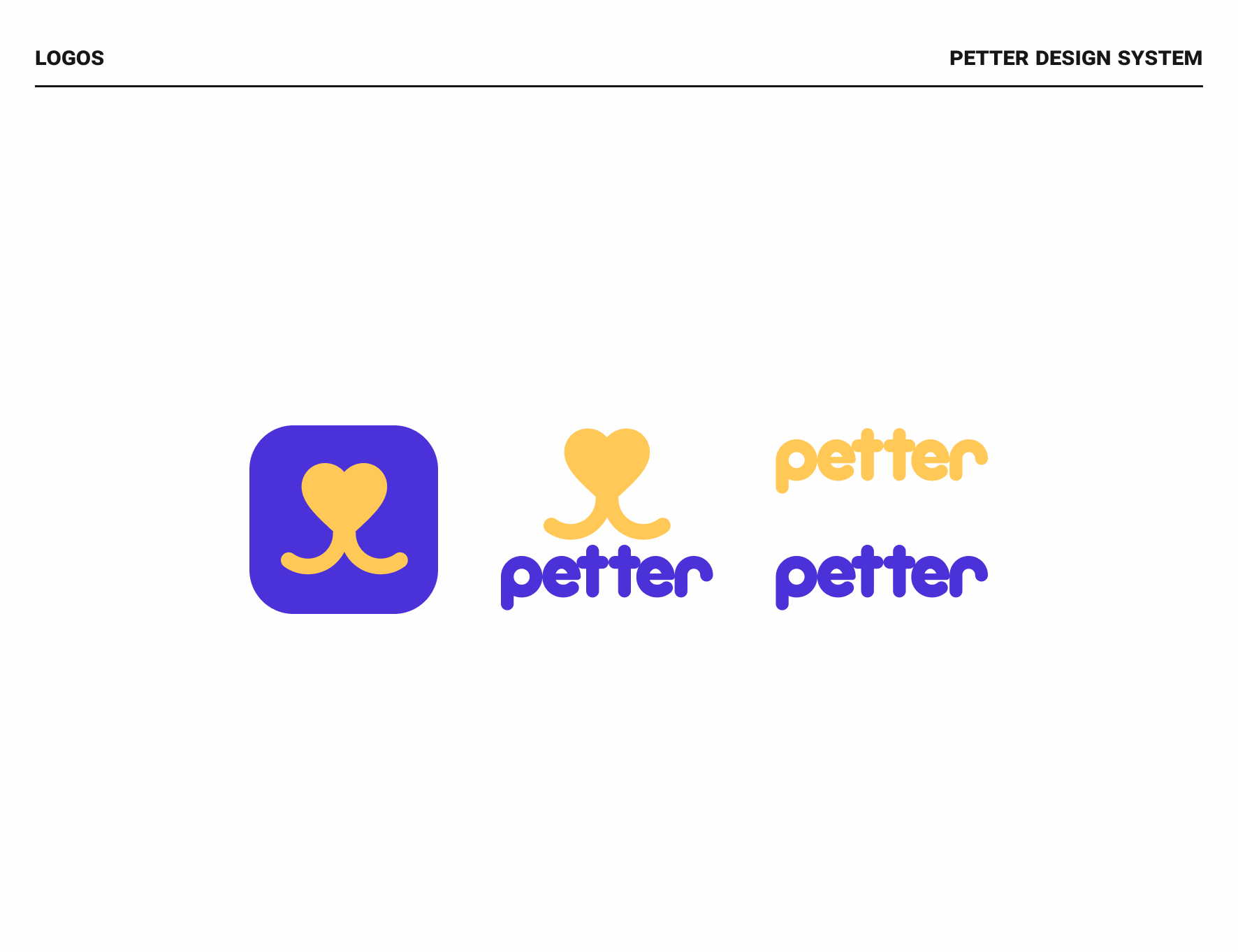 The following design system is the culmination of visual design choices that are both familiar to users and unique to the Petter brand. The hero color is a vivid purple and it is utilized throughout all of the app screens. It is complimented by the accent color, a bright yellow. These colors make the app feel friendly and playful, while still allowing the app to come across as clean and concise. Rounded buttons and forms further this duality. Illustrations were also drawn to complement the app’s ever present aesthetic.