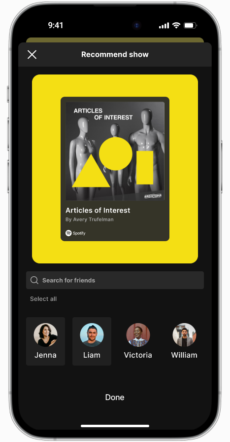 Simplifying the “Recommend Show” screen made users more comfortable with the process of recommending a podcast and helped them understand that this recommendation would occur within the app itself. Below is a demonstration of the tasks within the Spotify feature prototype.